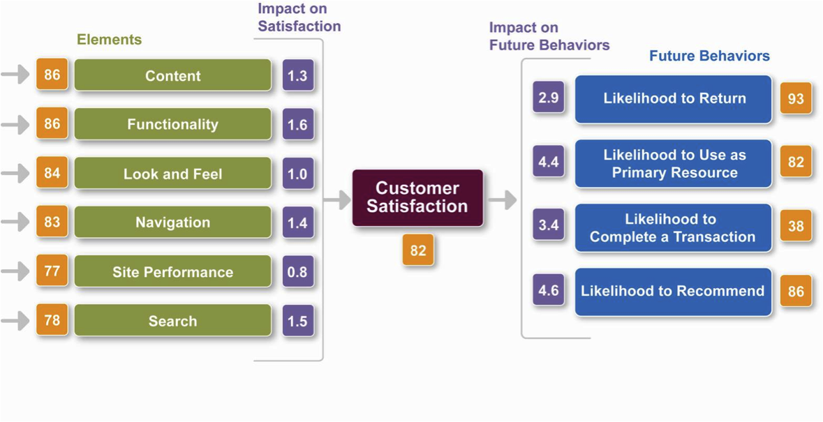 ACSI methodology provides a financial model that is sensitive to the specific business objectives such as driving sales on-line or increasing sales in the store. The model’s financial and behavioral predictions are driven by satisfaction metrics that directly affect outcome and can be changed by actions that improve user experience such as changing content, improving navigation, shortening process paths etc.