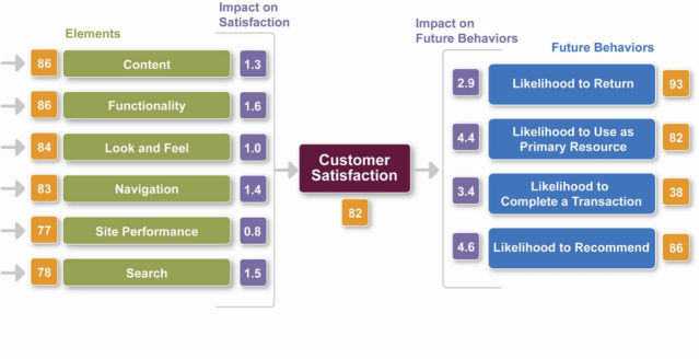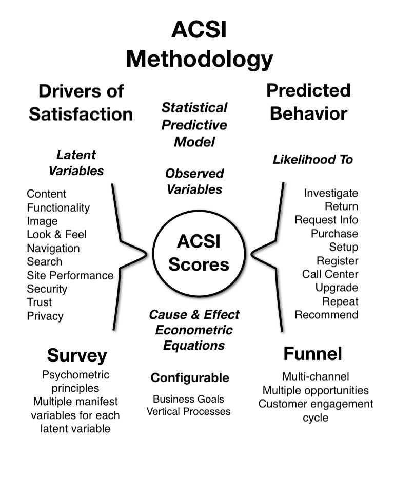 The ACSI Methodology for Voice of the Customer analysis includes using latest psychometric principles in developing survey questions that collect the right data and then relate this data in a causal manner to business objectives [2]. A distinguishing feature of the survey design is to measure each latent variable (the things we want to know about the user satisfaction) using multiple manifest variables (the things that can be asked or observed in a survey). This along with the 10 level scale for responding favorably or unfavorably to each question provides a richly varied data set that can more precisely measure latent variables such as content appropriateness, search effectiveness, ease of use, or look and feel, than attempting to directly measure each with a single yes / no response.