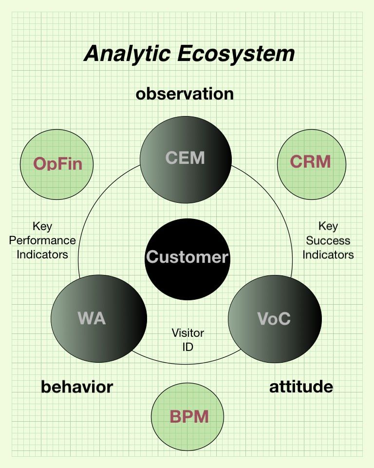 There is much presented now a days concerning analytic ecosystems [1]. It is difficult to determine whether we are at Web Analytics 2.0 or 3.0 or perhaps being superseded by something completely different such as traditional Voice of Customer (VoC) or Social CRM or Enterprise Feedback Management (EFM) now morphing into Customer Experience Management (CEM). Each company will have their spin on how and with whom they play in the analytic space.